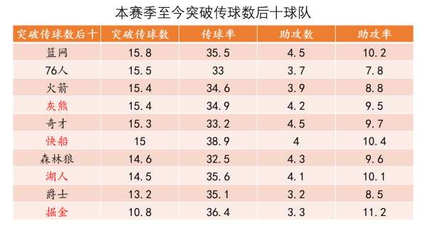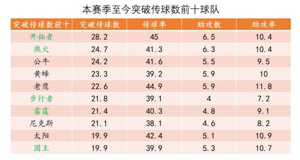 除了开拓者外,突破传球数前十中的热火国王面对残阵勇士时仅仅依靠第4节发力便轻松赢球,残阵步行者更是靠着突分赢下了勇士、拿下赛季首胜。里面的很多东部球队勇士尚未碰到,未来大概率也会大大考验球队防守了。