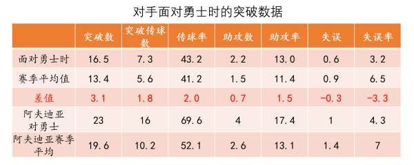 上表是我做的球员在面对勇士时的突破数、传球数助攻数以及失误数的数据,以及与赛季平均值的比较。可以看到面对勇士时,对手的第1突破手通常都有更多的突破数、传球数以及助攻数,还能拥有更少的失误。可以说勇士的防守策略就是给这一类球员很舒服的施展空间,比如罗林斯的一战成名。