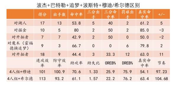 说完不开心的,再说一点开心的。本场比赛巴特勒单独带队的衔接段表现不错,特别是在第2节开局的近6分钟时间内拿下了11分的正负值。从比赛观感来看,巴特勒在与科尔针对衔接段阵容进行交流之后确实有了一些改善——第二节的衔接段不在放穆迪、而是替换成了希尔德,与此同时希尔德的角色也从一个快攻中频繁空切、阵地战进攻也总是去持球的角色,简化为了纯粹站定点的射手、频繁空切的角色则由波杰来顶上,这招也把波杰给激活了。事实上,波杰巴特勒追梦波斯特这4人组本赛季搭档希尔德的表现是比搭档穆迪要好的,根源就在于两者对该阵容进攻的帮助差异较大。
