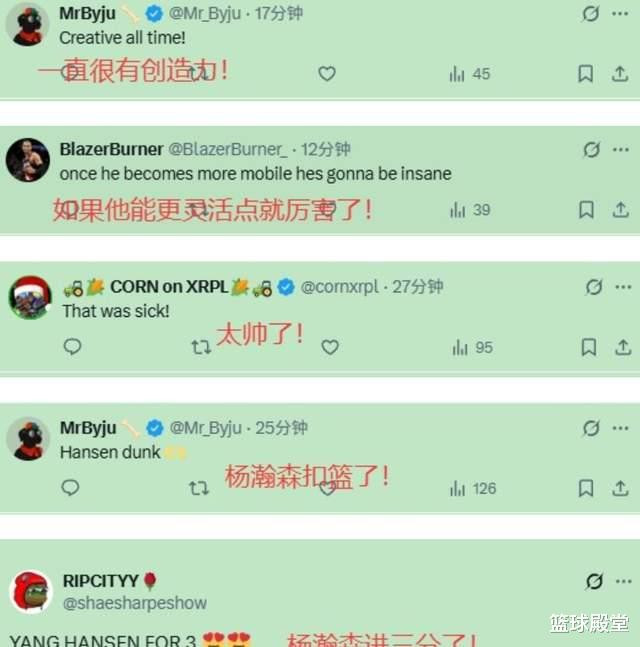 即便是这样,杨瀚森还是获得了美国球迷的认可,他们表达了杨瀚森有创造力。这里的创造力肯定就是因为他的策应能力,这对于他来说一直都是基本盘。而且在他扣篮和打进三分之后,也有球迷称赞。只是末节打完,估计美国球迷还是被指责。幸好杨瀚森私下的训练量一直都非常好,这有利于他的成长。只是目前的成长速度还是太慢了,杨瀚森需要抓紧再抓紧了。